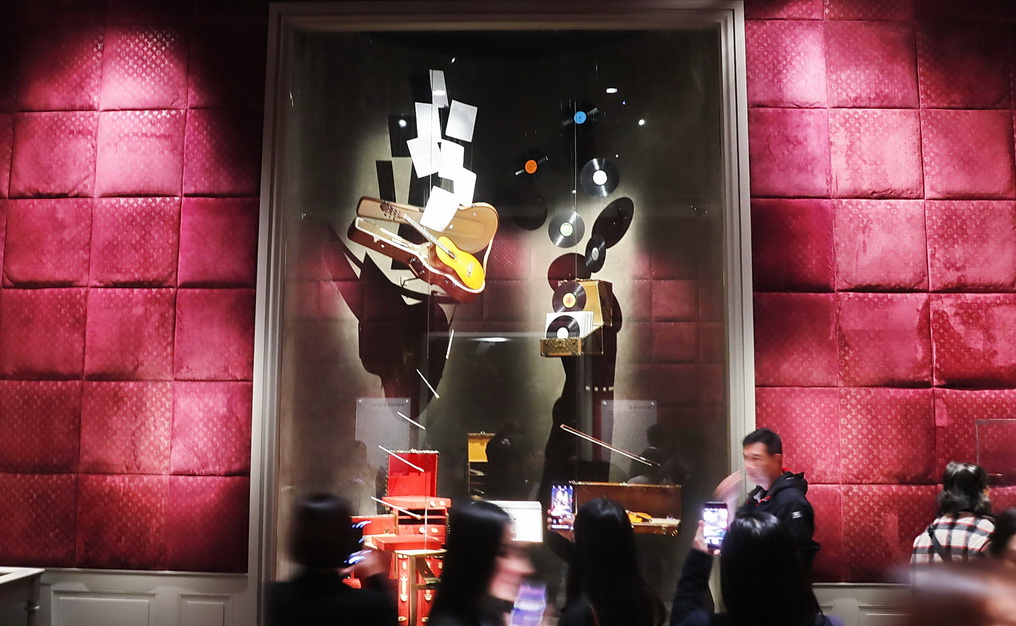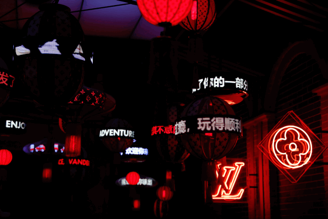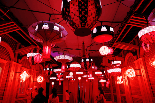 一入展厅便是极具上海风味的弄堂景象,LV的经典monogram印花logo裹在大红的灯笼上也是别有一番风味。走在“弄堂”中,两边不时传来自行车的车铃声、人的交谈声,恍惚间仿佛回到了上世纪的老上海。