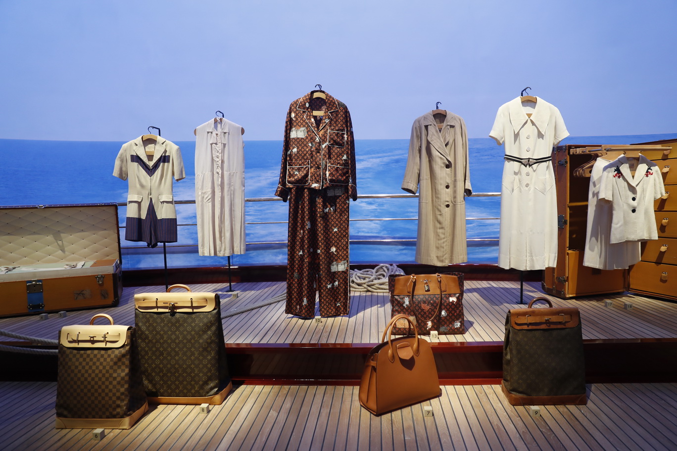 “探险”展厅中巨大的船帆告诉我们,这次旅行在这里才正式启航!展厅被船帆分割成一半海洋一半沙漠,而我们就站在这船板中央,望着这些不同年代的经典箱包和服饰,感受1924-1925这个时期,路易·威登(Louis Vuitton)是如何为当时正在进行“黑色远征计划”的雪铁龙团队量身打造日常所需的行李装备。