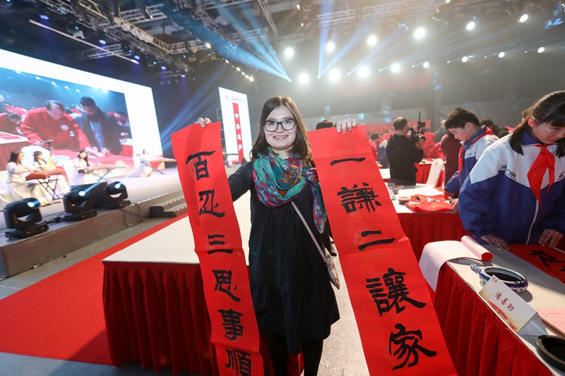 春联大会现场,书法艺术家刘小晴挥毫,与水袖舞者共同完成《功夫墨韵》的表演,向现场观众送上“岁畅春和”的美好祝福;在弹词开篇《梅竹》优雅的吴侬软语中,上海书法家协会主席丁申阳写下“引入沪春风,流连浦江;执生花妙笔,谱写乐章”。在杂技表演里也蕴含“春联”意趣,只见由300张福字拼贴而成的“福满浦江”四字从天而降,将气氛推向高潮。沪上百位书法名家还共同执笔,教百位书童写春联、写福字,传承春联文化,并作品赠送给各行各业的时代先锋,成就一段佳话。