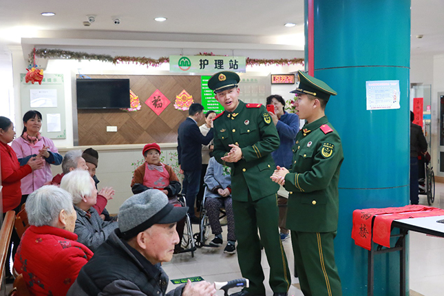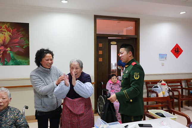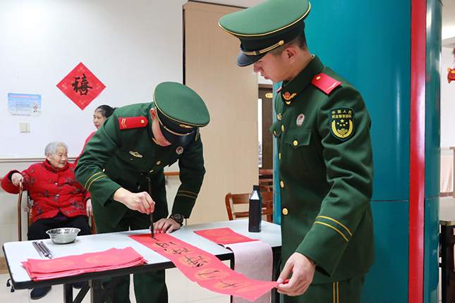 战士们除了陪伴老人聊天解闷、打扫卫生,还为老人现场书写春联和福字,为敬老院带来浓浓的年味。上等兵陈宇入伍前是美术学校的学生,有一定的书法功底,写下的春联得到老人们的称赞;卫生员师磊玉在聊天中为老人提供健康咨询;中队理发员胡海刚带上了理发工具,为几位老人“设计”了新年发型;考虑敬老院老人大多数是上海本地人,上海籍新战士计思宇和战友们特意准备了上海滑稽戏等节目,赢得了爷爷奶奶的阵阵掌声。