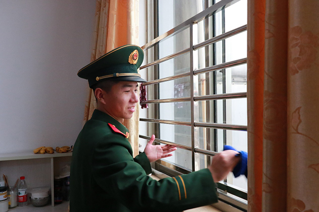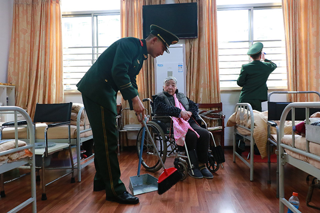 ▲武警战士为老人打扫卫生