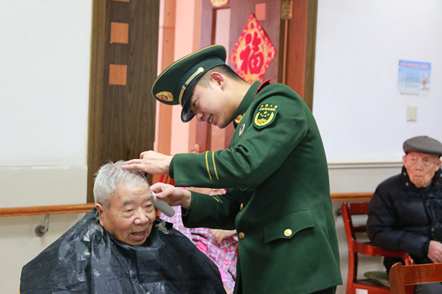 ▲武警战士为老人理发