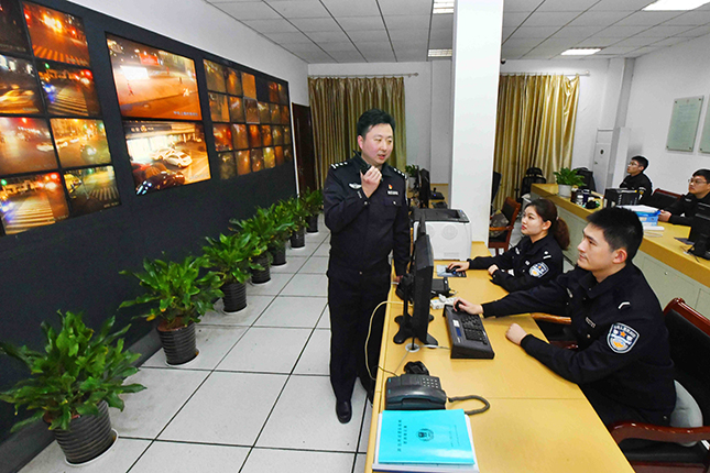 ▲徐汇公安分局康健派出所民警在监控室值班,时刻关注街面治安情况。