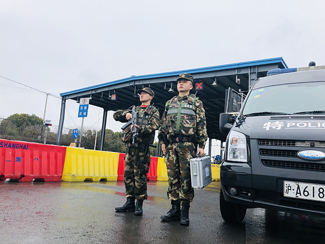 ▲武警上海总队执勤第五支队官兵在高速道口备勤。