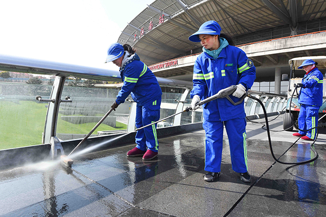 ▲徐汇区绿化市容环卫局上海南站女子清洁班员工放弃回老家过年,坚守工作岗位。