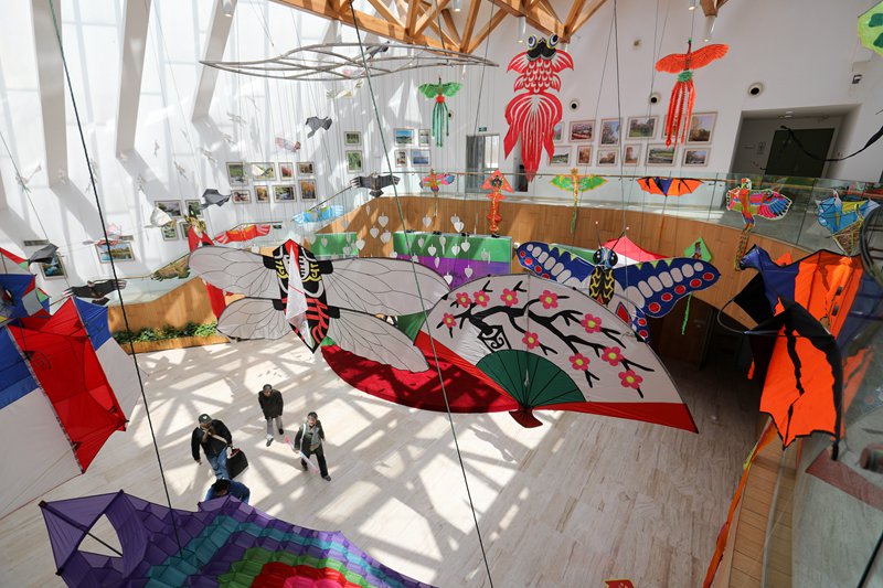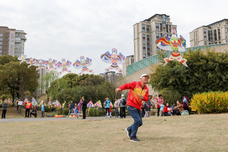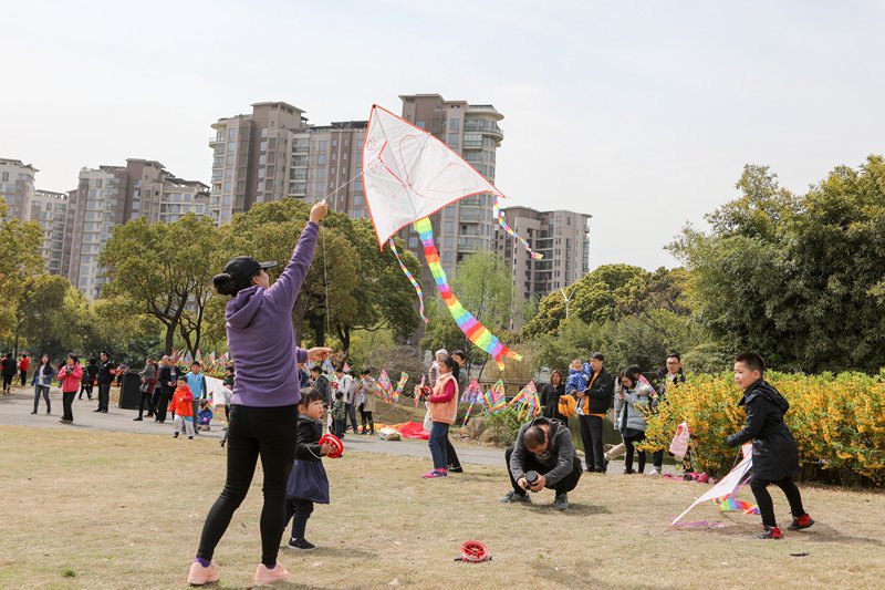 场地上,盘鹰风筝上下翻飞,巨龙风筝绵延数米,风筝以天为幕,争奇斗艳。140余名高手齐聚新江湾参加的风筝大赛,龙类风筝、板翅类风筝、盘鹰风筝、运动双线风筝轮番登场,展现风筝技艺的独特魅力,也让观众对“风筝制作与放飞”这一非物质文化遗产的传承发扬产生了浓厚兴趣;草地另一头,亲子风筝体验活动吸引众多大朋友小朋友携手参与,一派其乐融融春日图景。