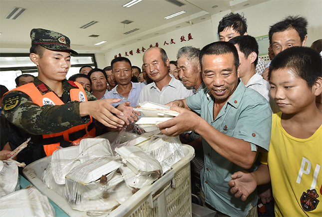 正在紧张进行防汛抗台准备的武警上海总队机动二支队接到工地领导紧急求助后,连夜帮助600余名工友从危险的工棚转移到该部营区,并主动将营房腾出来让给群众,官兵们则在礼堂打地铺,再现了当年部队进驻上海时睡马路的光荣传统。