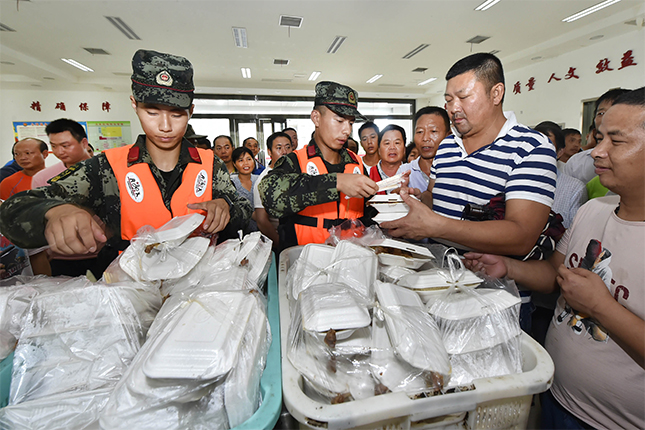 ▲昨天午餐时战士们给避风的工友们发放盒饭
