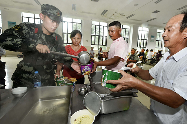 昨天上午,记者在现场看到,部队按照官兵们的伙食标准为工友们提供早餐,馒头、稀饭、可口小菜应有尽有。