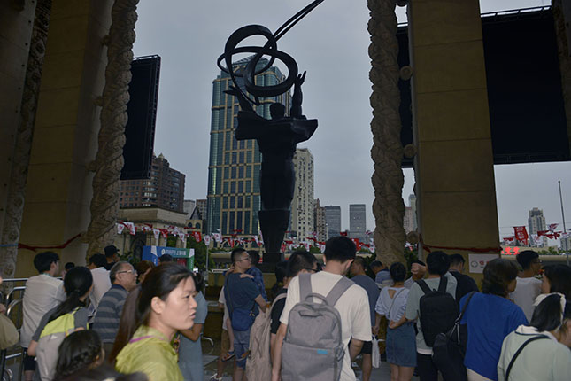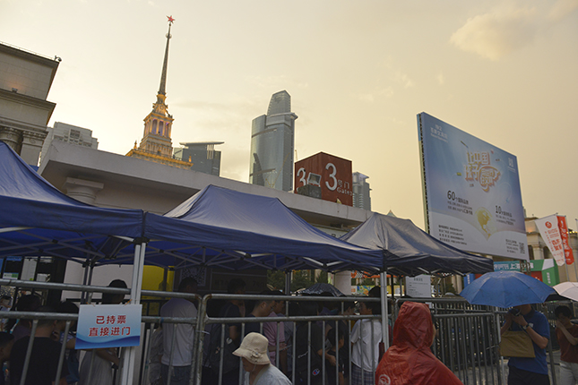 待雨势减弱,天空逐步放晴,上海展览中心的夜灯亮起。书展门口排队买票等待进入的读者依旧在排着长队。