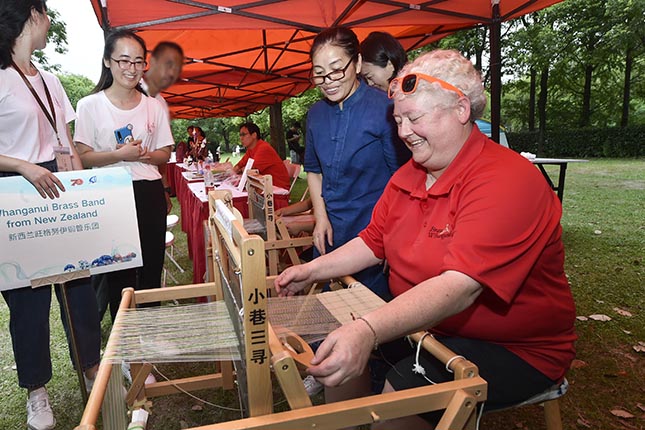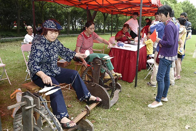 除了开幕式精彩纷呈的演出,华泾公园大草坪上还有三锭纺纱、织布、布艺、面塑、糖人、剪纸、黏土等形式多样的非遗体验项目供社区居民现场体验,让市民在欣赏到精彩的海内外节目的同时,还能领略到非遗传统文化的无穷魅力。
