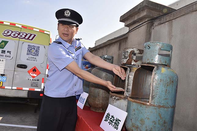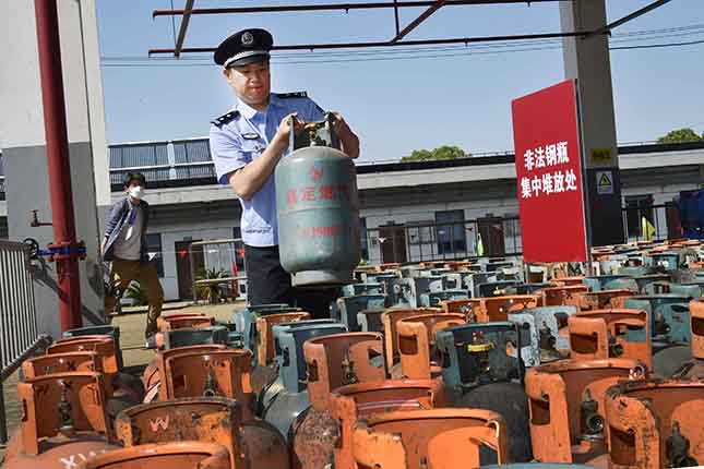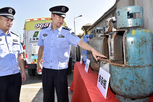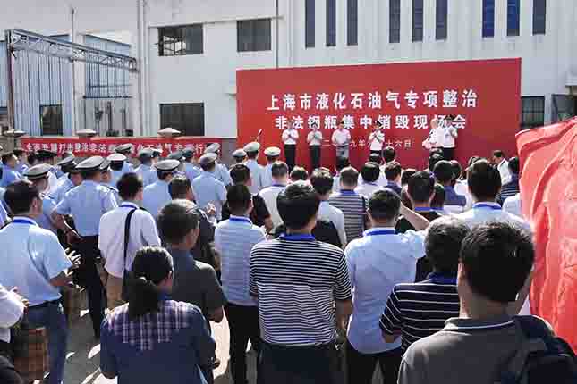 9月16日下午, 上海市公安局会同市住建委在浦东新区合庆钢瓶检验站集中销毁了一批在打击非法经营液化石油气专项行动中收缴的非法液化石油气钢瓶。
