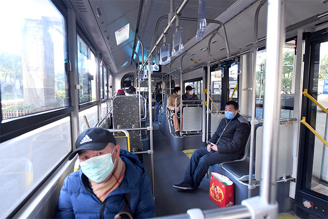 在7 1路中运量公交车上可以看到乘客较上周略有增多,男女老少均佩戴口罩。