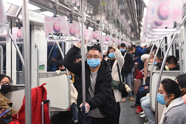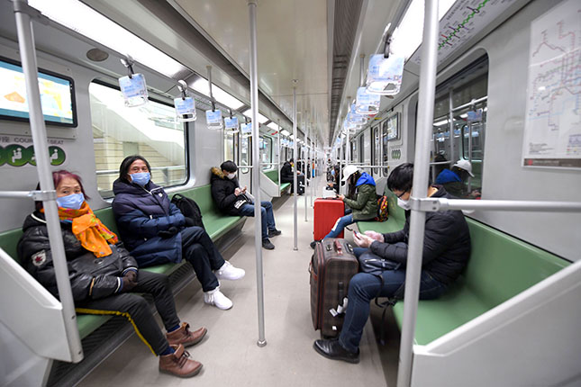 地铁2号线日间客流相较上周有明显增多趋势,少有一人独享一节车厢的情况出现。从地铁车厢内可以看到返沪客流仍在持续涌入,地铁内乘客无一例外均佩戴口罩。可以看到部分乘客防疫意识之强,除了里三层外三层将自己裹得严严实实,甚至连行李箱都包上了塑料膜防止病毒沾染。