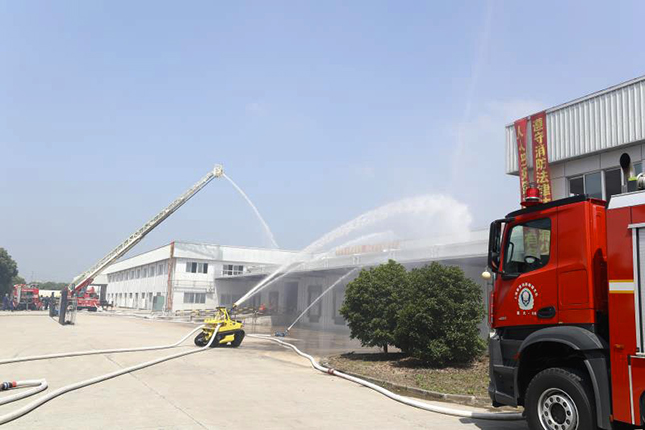 演练假定一冷链物流仓库8号库内靠墙进行敷设的冷风机供电线路接头处过热,引燃周边聚氨酯泡沫保温层,导致剧烈燃烧并迅速蔓延扩大。员工发现火情后第一时间报警并立即按下报警按钮。单位微型消防站迅速赶往处置。撤离过程中,一名员工情急撞伤脚部,被困火场。消防指战员赶到现场后,第一时间搜救被困人员,同时出动消防机器人、云梯车、高喷车和大功率远程供水车协同打击火势。