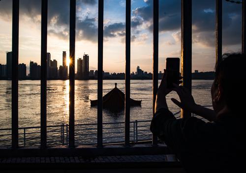 ▲7月13日,市民在即将被淹没的武昌黄花矶凉亭前拍照。
