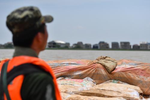 堤坝之上,武警江西总队机动支队的战士,沿堤坝垒起高1.5米、长1500米的“土龙”,将洪水死死拦截在外……