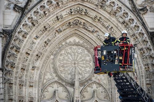 ▲7月18日,消防员在发生火灾的法国南特市圣皮埃尔与圣保罗大教堂工作。