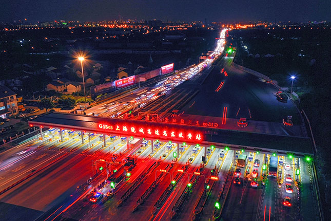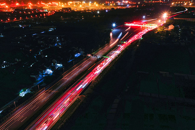 晚上8点45分左右,记者在高东收费站看到前往崇明方向的拥堵缓行车辆绵延数公里,无数的车灯汇聚成一条明亮的长龙。