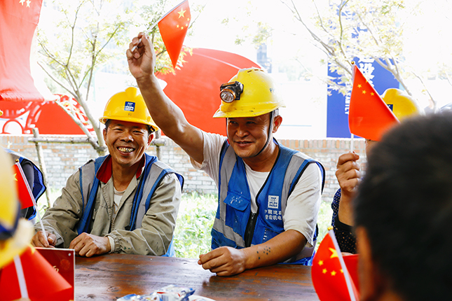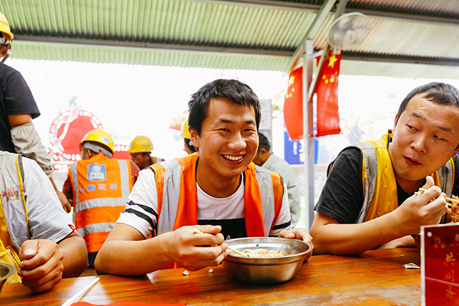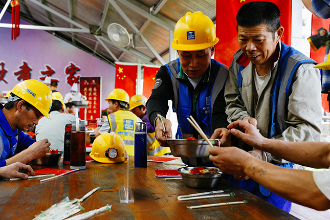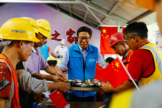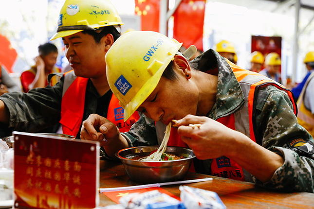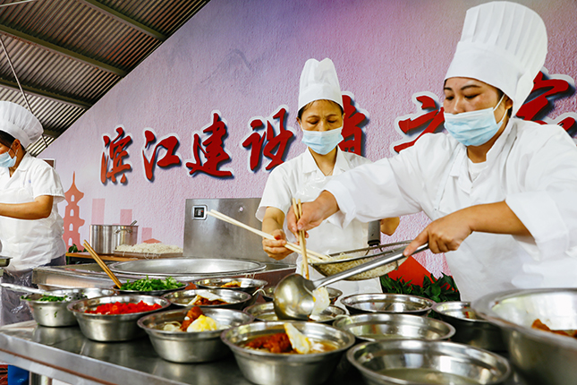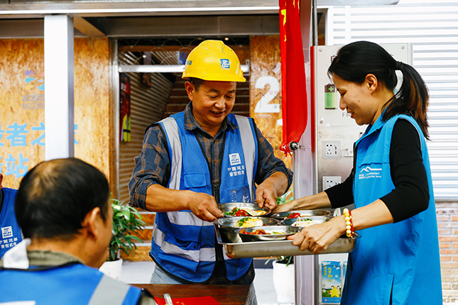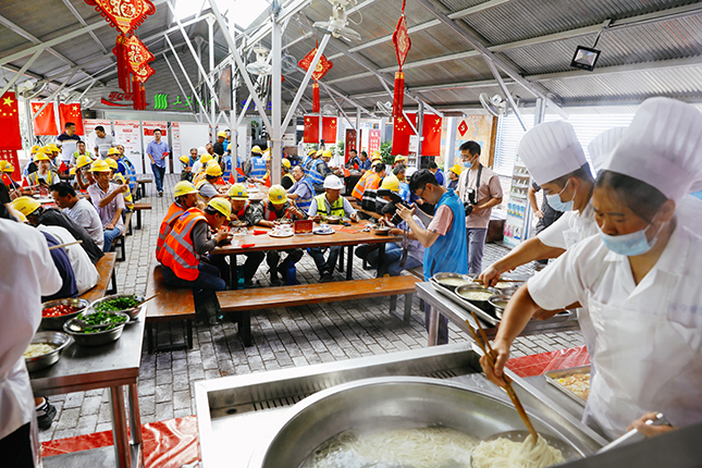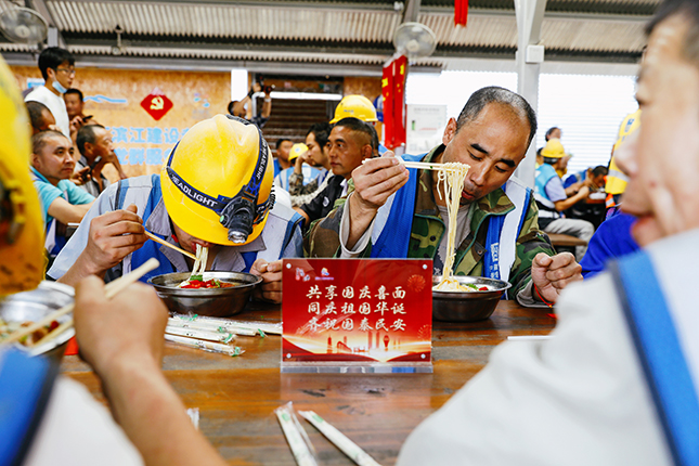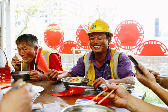 国庆中秋双节当日,上午10点30分,200余位国庆留守一线的建设者陆续来到徐汇滨江建设者之家,党员志愿者为建设者们送上热气腾腾的“国庆面”。