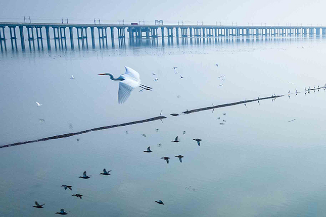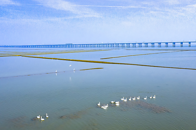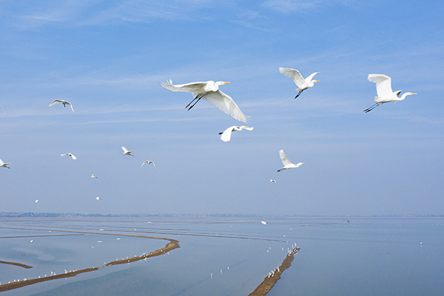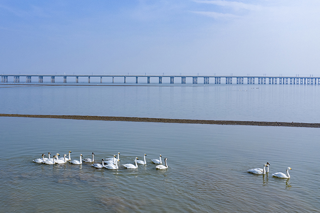 眼下正是冬季,在石臼湖岸上,能看到天鹅在滩涂信步,白鹭在翩跹起舞,成群结队的候鸟振翅高歌,凌空翱翔,充满了童话色彩,成为一道独特的风景。