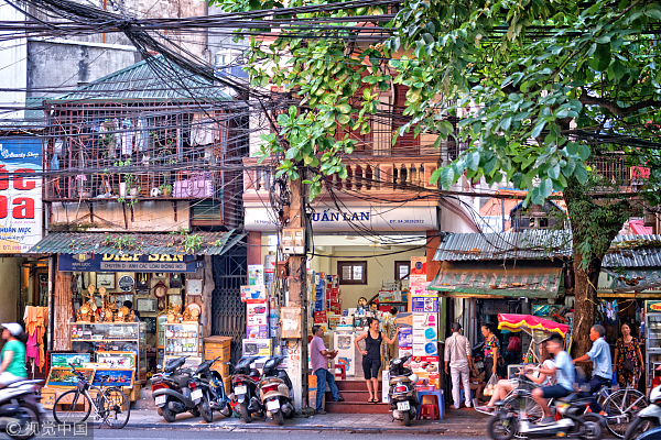 ▲越南河内的老城街道,低矮建筑簇拥,摩托车阵阵轰鸣,空气里飘着的酸辣气味,这是河内的标志性特征。|视觉中国