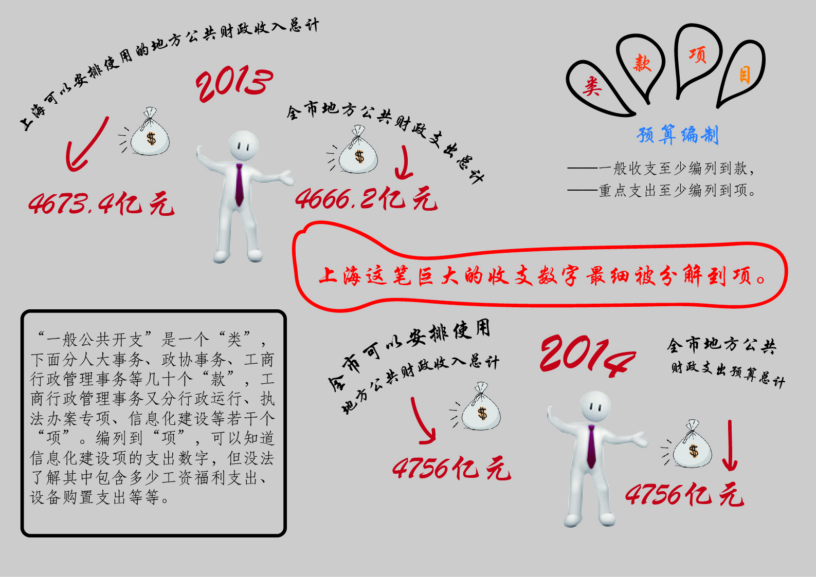 人大代表们看的是多大一本账呢?2013年,上海可以安排使用的地方公共财政收入总计4673.4亿元,全市地方公共财政支出总计4666.2亿元,收 支执行结余7.2亿元。2014年,全市可以安排使用的地方公共财政收入总计4756亿元,全市地方公共财政支出预算总计4756亿元,收支预算平衡。
