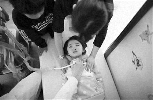 2月27日,日本二本松,医护人员为5岁的日本女童做检查。