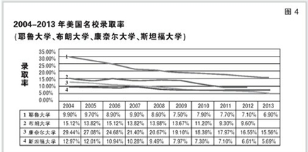 申请竞争越来越激烈,录取率自然持续走低。其中,下降最明显的是康奈尔,2004年的录取率达到近30%,到2013年,录取率降到15.56%。四校中,耶鲁大学录取率的下降幅度最小,但也由2004年9.9%的录取率,下降到了2013年的6.9%。斯坦福大学的录取率也由2004年的12.97%,下降到了2013年的5.69%。