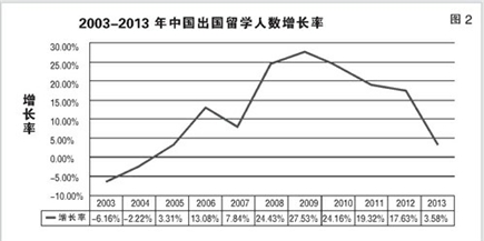 进入2000年后,我国每年出国留学的人数除了在2004年有小幅下滑,一直呈上升趋势。在2001年,出国留学人数增长率甚至达到了115.38%,此后,增长率出现了短时间大幅下降,之后一直平稳回升,出国人数每年都以两位数持续高速增长。直到2013年,增长率下滑到了3.58%。