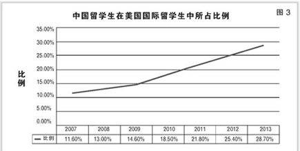 先来看看,中国到赴美留学的学生多到什么程度。美国每年公布的“开放报告”提供了较客观的情况:中国留学生在美国国际学生中所占的比例从2007年的11.6%增长到了2013年28.7%。换句话说,如今美国每10个外国学生里,就有2-3个中国学生。另外,2008年前,美国国际学生最大生源国还是印度,中国排第二。而到了2009年,中国上升到第一位,成为美国的最大留学生生源国。