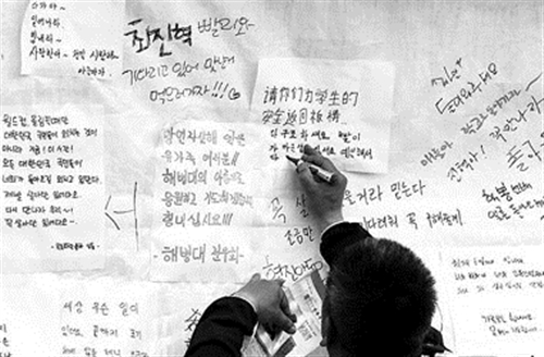 21日,韩国珍岛,满墙的留言表达了民众对“岁月号”沉船事故失踪人员的祝福和祈愿。CFP