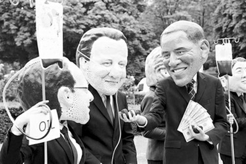 3日,在位于布鲁塞尔的欧洲理事会大楼外,牛津饥荒救济委员会成员扮作G7峰会各领导人,举行名为“能源自主与财富不公”的示威活动。活动现场“G7领导人”各个“患病”在身,正在接受能源治疗。照片中成员假扮的领导人(从左至右)分别为法国总统奥朗德,英国首相卡梅伦与美国总统奥巴马。