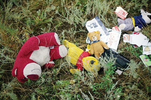 图为玩具熊等遇难者遗物散落在MH17坠毁地点附近。