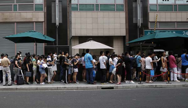 这一排队现象同样也出现在上海美领馆。7月28日上午7时30分,位于上海南京西路梅龙镇广场楼下的的马路边就排起了长队。在队伍前最前端的一支遮阳伞下,立着一块“欢迎来到美国驻上海总领事馆签证处”的易拉宝,两位领馆工作人员坐在牌子前,依次核对每位排队者的姓名和护照,如果排队者的姓名在当天美领馆预约面试的名单上,工作人员就会发给排队者一张A4纸大小的塑封牌,让其有次序地乘电梯上到梅龙镇广场八楼的签证中心参加面签。如果搁在平常,这支已成为上海都市一景的美签排队现象不到中午就会消失,但是由于几天来美国签证系统出现崩溃,加上前两天又逢双休日领馆不开放,导致今天排队的人流比往常多很多,直到中午午饭时间了,排队人流依然有增无减,有不少人并非前来面试,而是来探听情况的,以决定自己是否需要递交申请。