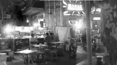 近日,笔者来到多伦路一探究竟。21时左右,不少居民出门散步,夜色中的多伦路一片寂静,两个路口均无摆摊现象。22时30分,仿佛接到了某种信号一般,小贩陆续从四面八方赶来,开始准备食材,铺设桌椅,摆起夜排档。其中,有粥铺、小炒铺,但多数为烧烤摊。不一会儿,四川北路多伦路路口就有15家夜排档一字排开,占领了此处的人行道与非机动车道,百米之外就可见到袅袅白烟。另一边,东江湾路多伦路路口也出现两、三家烧烤摊,整个多伦路俨然沦为了“烧烤天堂”。