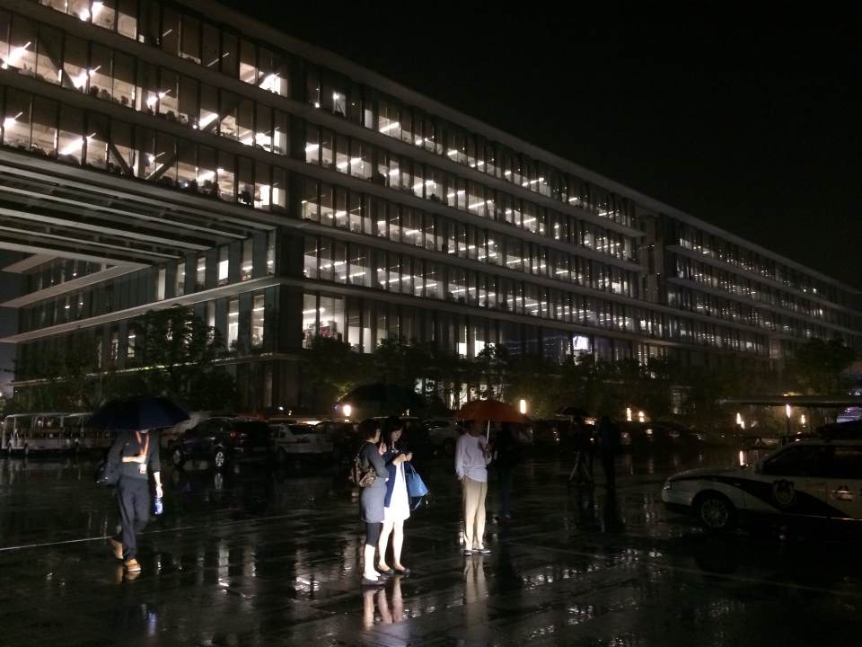北京时间晚上7时徐,本报记者进入阿里巴巴在杭州西溪园区的总部,杭州的天气阴雨绵绵,夜色中阿里巴巴总部所有的大楼却灯火通明,所有员工聚集在一起,等待阿里巴巴的IPO。