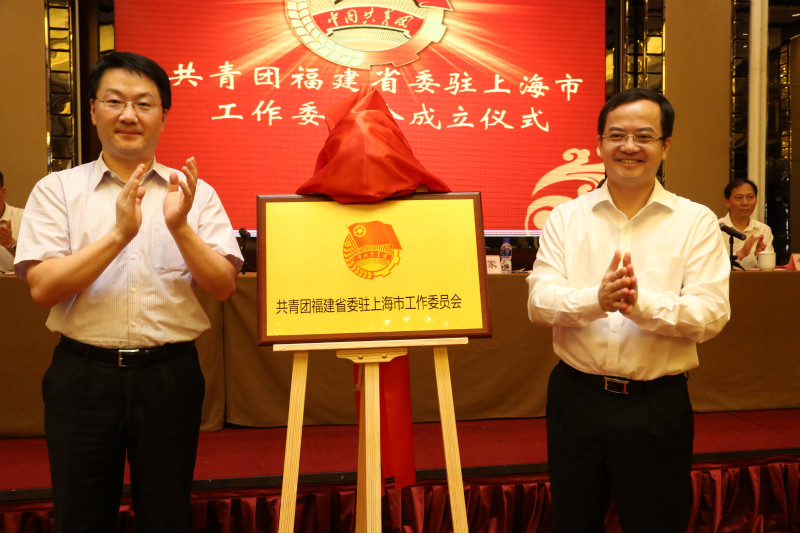 福建团省委书记何明华(右)与上海团市委书记夏科家为福建驻沪团工委成立揭牌