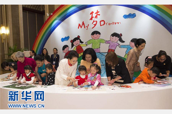 据新华社北京11月10日电10日,国家主席习近平夫人彭丽媛同参加2014年亚太经合组织领导人非正式会议的部分经济体领导人夫人出席由中国残疾人联合会主办的“促进残疾人共享经济社会发展成果”主题系列活动。