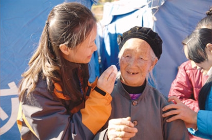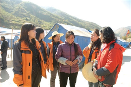在上海社工的关怀下,灾区妇女的脸上又重现笑容。 孙丹摄