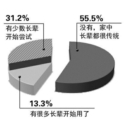 调查显示,约有半数中老年人群并没有使用手机参与春节活动的习惯(55.5%)。身边长辈中,有少部分使用手机参与春节活动的用户,占比31.2%;而发觉身边很多长辈都开始“手机春节”的用户,占比13.3%。