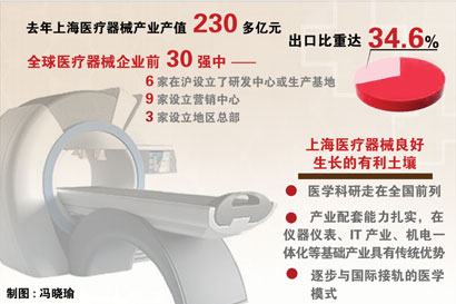 经历十多年发展,上海的医疗器械产值已不容小觑。统计显示,2014年上海医疗器械产业产值达230多亿,出口比重达34.6%。与此同时,全球医疗器械前30强有6家在沪设立了研发中心或生产基地、9家设立营销中心、3家设立地区总部,跨国公司总部经济在稳步增长。