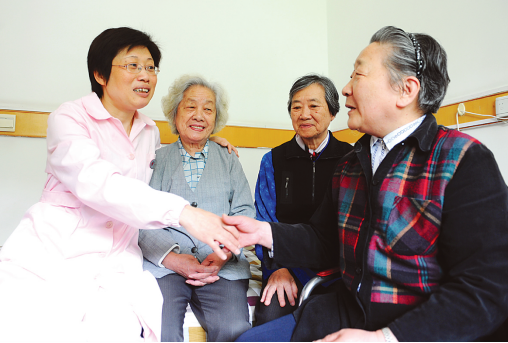 在普陀区社会福利院,老人们有什么心里话都愿意和肖玉荣(左一)说一说。 袁婧摄