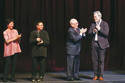 颁奖嘉宾吕其明(右二)、赵汝蘅(左一)为艺术节特别贡献奖获得者小提琴家列宾(右一)、导演田沁鑫(左二)颁奖。 本报记者 叶辰亮摄