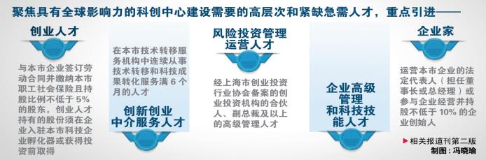 在引才对象方面,《办法》坚持需求导向,聚焦建设具有全球影响力的科创中心需求,重点引进五类人才:创业人才、创新创业中介服务人才、风险投资管理运营人才、企业高级管理和科技技能人才、企业家;在政策梯度方面,兼顾各类创新创业人才的不同政策需求,在居住证积分、居转户、直接落户三个政策梯度上分别进行突破,形成梯度明晰、相互衔接的创新创业人才引进政策体系,给准备前来上海、留在上海、扎根上海的创新创业人才以稳定预期。