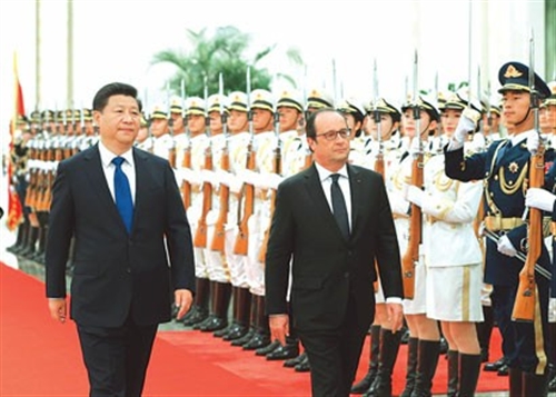 昨天,习近平同法国总统奥朗德举行会谈。会谈前,习近平在人民大会堂北大厅为奥朗德举行欢迎仪式。 新华社记者 马占成 摄