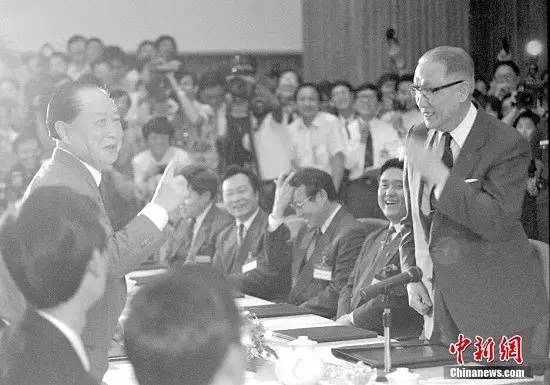 1993年4月27日,时任海协会会长汪道涵和海基会董事长辜振甫共同在新加坡举行“汪辜会谈”,这是海峡两岸隔绝40多年后举行的首次会谈。中新社记者 贾国荣 摄