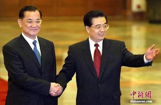 2005年4月29日,中共中央总书记胡锦涛在北京人民大会堂会见中国国民党主席连战。中新社记者 廖文静 摄