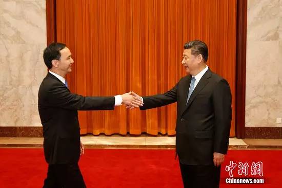 2015年5月4日,中共中央总书记习近平在北京人民大会堂会见中国国民党主席朱立伦。中新社记者 盛佳鹏 摄