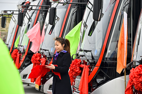 今天每一辆车的车头都挂着大红花,车厢里挂的中国结,显得非常喜庆,等待着第一批客人。